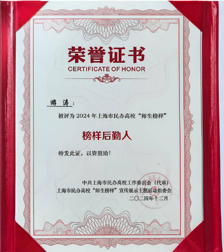 恭喜游涛老师荣获首届上海市民办高校“榜样后勤人”称号