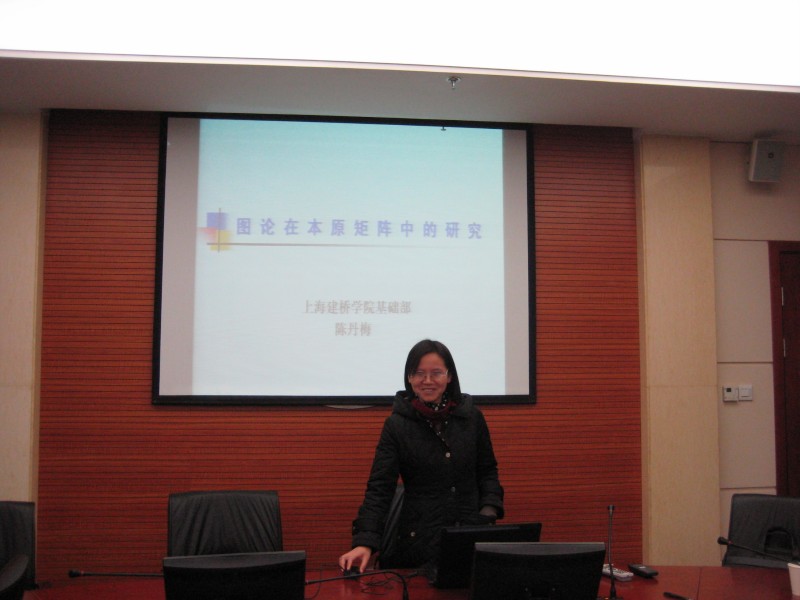2011年12月21日,基础部陈丹梅博士以《图论在本原矩阵中的研究》为题为我校基础部和机电学院部分教师做了一场生动的讲座。陈博士根据其已有研究,在已经完成的上海市优秀青年科研专项项目及我校校级科研项目研究的基础上,重点讲解了图论的应用、图论的研究现状、本原矩阵中的一些概念、迹为d的中心对称本原矩阵的指数集和奇围长为r的中心对称本原有向图的指数集等内容,从研究方法上拓展了教师的视野,为教师们了解新的领域积累了知识。在座教师听了陈博士的讲座后,展开了热烈的讨论,每个人都针对此议题和内容发表了自己的看法。本期博士论坛是2011年的最后一期,在此画上了圆满的句号。这一年博士们各展鲲鹏,在自己的学术领域内都有不小的进展,为明年博士论坛的举行奠定了良好的基础。