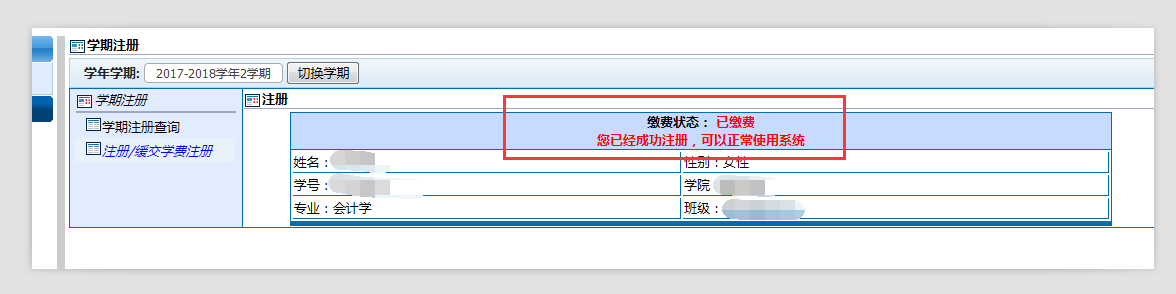 *请同学们务必点击切换学期,学期选择不正确将无法注册;注册人数过多可能造成系统卡顿,缴费状态显示不正确的同学请尝试点击“切换学期”按钮解决此问题。