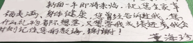 董海珍来自海南黎族,英语基础差,也胆怯害羞。学院安排了她勤工助学,借着这个机会,谭湘蓉只要有空就帮她补课。“谭老师,你说不需感谢、不需要礼物,但是我非常感谢你,在你帮助下,我从4门不及格减少到2门……”一个学期后,这名刻苦学习的女孩,成绩有了进步,也有了更多自信的笑容。