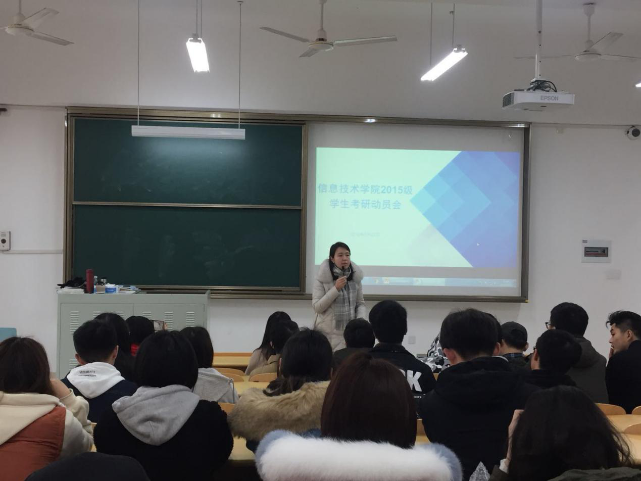 为了让同学们明确考研目标和方向,信息技术学院于3月22日下午启动了15级学生考研动员大会。院长徐方勤、党总支副书记杜鹃、15级全体辅导员老师及15级有意向考研的近80名学生出席此次动员会。