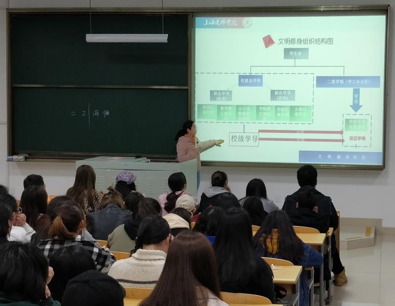 辅导员王丽佳仔细地为同学们讲解了文明修身的组织结构,解答了同学们“为什么要文明修身”的困惑,并希望学员能够用心体会。