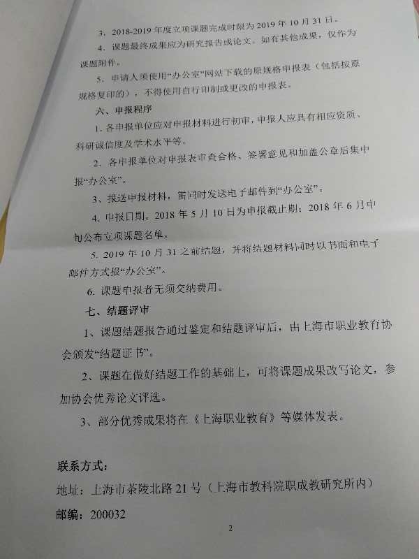 2018-2019年度职业教育协会课题申报工作已启动,为了做好我校该项目的申报工作,现将《职业教育协会课题申报通知》转发给你们,凡有条件申报的教师应积极申报,申报截止时间为5月8日,申请者可登录“上海职教在线”网站下载《课题申报表》,届时应提交《申请评审书》纸质件3份(A4纸打印,左侧装订),相关申报的主要事项,见附件。