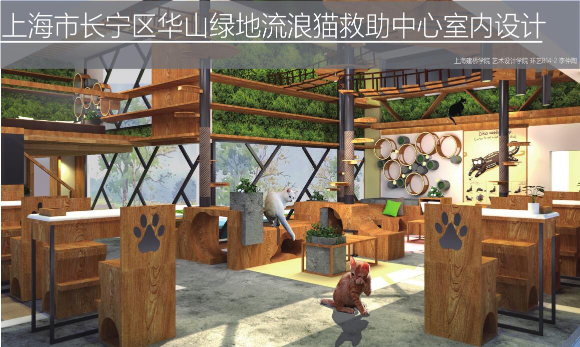 李仲陶同学作品《上海市长宁区华山绿地流浪猫救助中心室内设计》反映出对流浪猫、社会现象和人文精神的思考,在创新艺术思维的同时积极探索社会问题,体现出当代大学生的人文情怀与健康清新的审美风尚,获环境设计类作品一等奖。