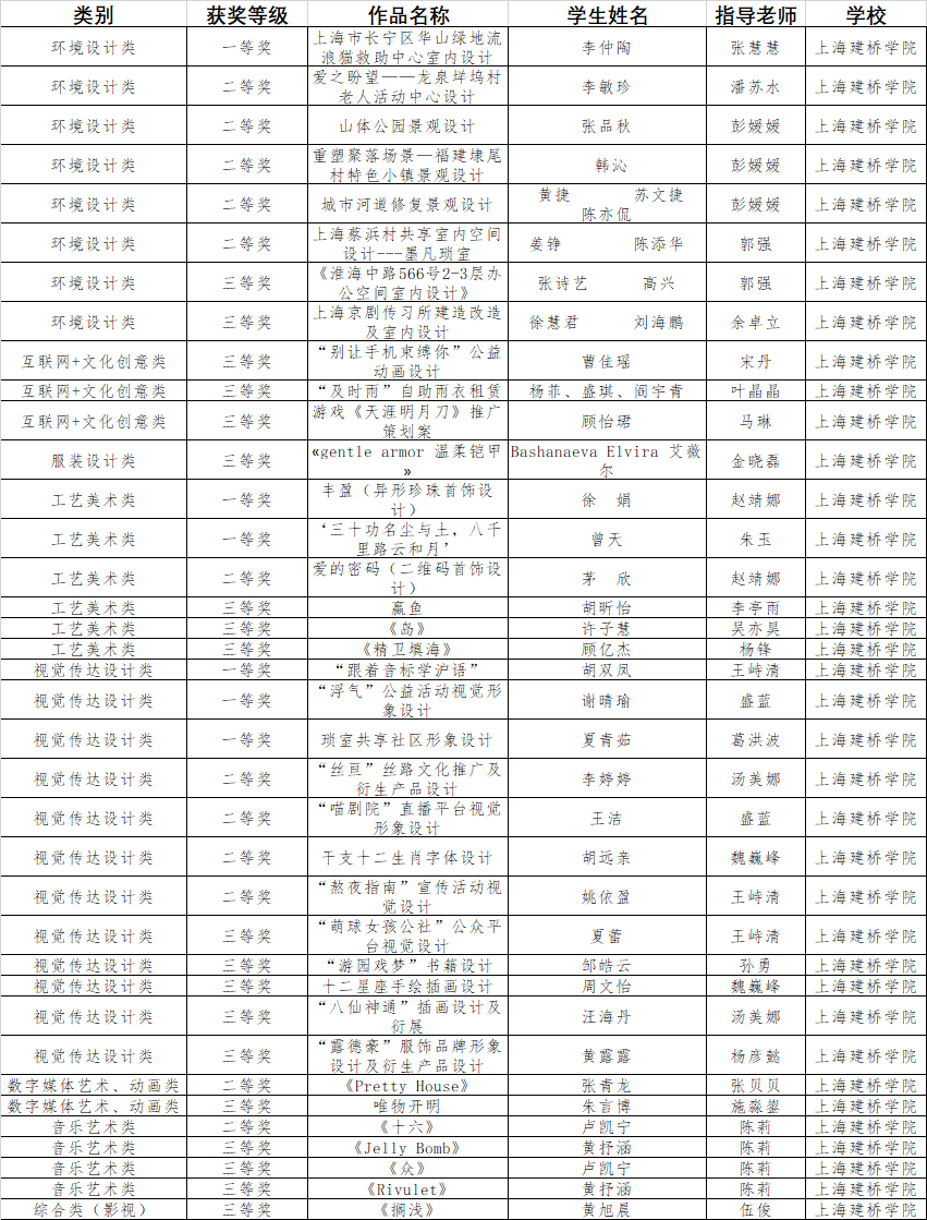 我校学生在环境设计类、互联网+文化创意类、服装设计类、工艺美术类、视觉传达设计类、数字媒体艺术及动画类、音乐艺术类、综合类(影视)等8个类别的比赛中均获奖项。