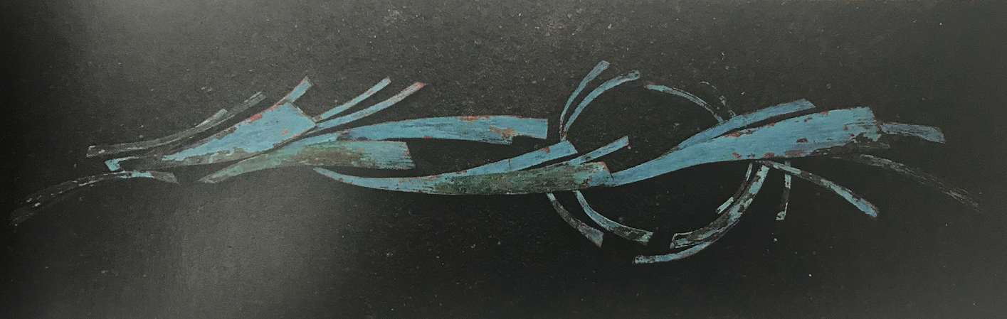 曾天同学的《‘三十功名尘与土,八千里路云和月’》,灵感源自岳飞额《满江红》,此时的岳将军回首往昔,三十年的沙场征战,八千里的追云逐月,都是为了实现保家卫国的功业理想。线条的造型无拘无束,有着广阔的延伸感,胸针与桌上器分别有着做旧捶打的肌理和铜绿的效果,体现一路风霜仍然不改初心的豪情壮志。