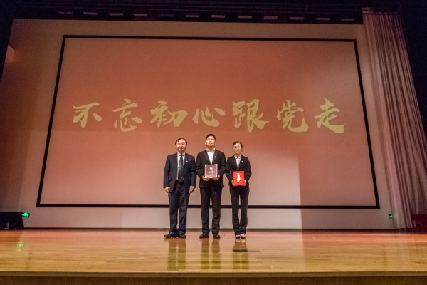 商学院分团委获得五四特色分团委称号,机电学院分团委书记张楚成(右)获得五四特色分团委书记称号,江彦桥书记为他们颁奖