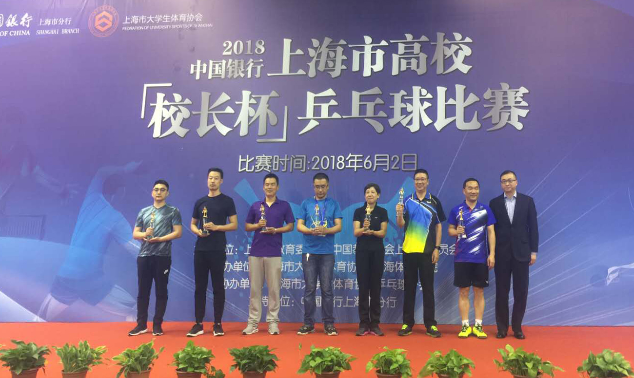 6月2日,2018年上海市高校“校长杯”乒乓球比赛在上海体育学院乒乓球训练馆举行。参赛选手为来自全市各高校的校领导,我校由周健儿副校长为领队,校党委副书记、副校长、工会主席夏雨,副校长俞晓光,董事施银节为队员,校体育教学部主任林恬为教练参加比赛。