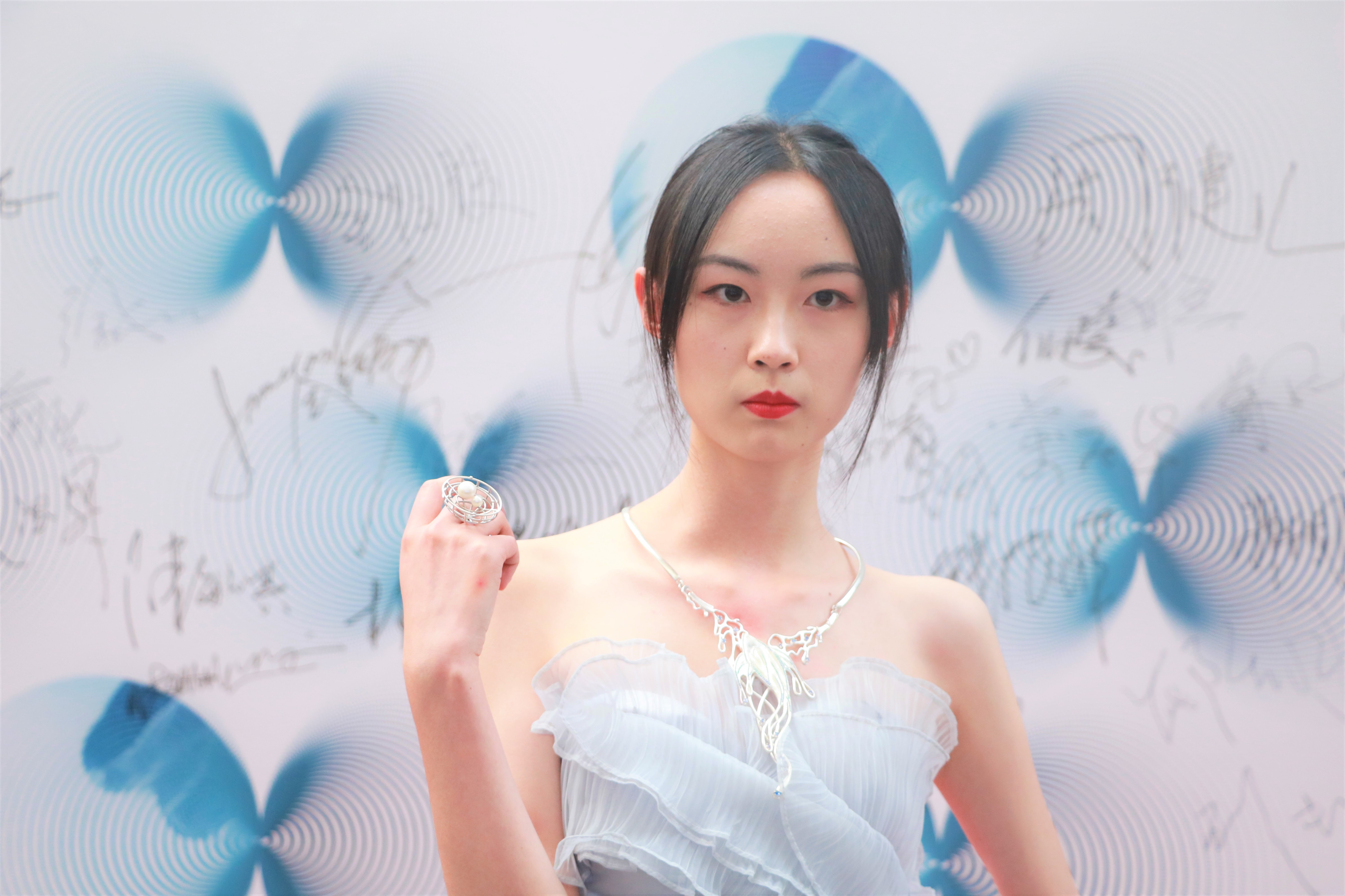 构思大胆前卫、用材跨越广泛、工艺多元复合、风格变化迥异的珠宝展品也让展会现场人气爆棚。如作品《柔》将水元素加入时尚首饰设计,以不同粗细、大小的亚克力作为容器,展现水柔而无形、随方就圆的特性,还让观众以“喜欢就滴一下颜料”的方式参与互动。作品《觅》部分采用了感温材料,通过恋人间佩戴时产生的不同温度,展示不同的状态,留下情侣爱情炙热痕迹。作品《文·符》从博大精深的中国文化中追寻灵感,将符号融于“字”中,又由“字”来衬托符号,展现古人尚未产生统一标点时,用精简的字来断句和转折的智慧。韩国学生Edwin的作品“HoRong”以韩国清酒为创意主题,以古代韩国人夜间在一种叫“HoRong”的灯前对饮、书画、聊天为启发,结合韩国传统瓦片与传统灯的特性设计酒瓶。