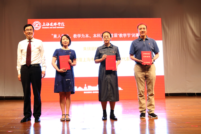 校长朱瑞庭为2017年度上海市教学成果奖获奖代表颁奖。长期以来,学校紧紧围绕应用技术型大学办学定位,坚持“质量核心,教学中心,学生本位,教师主体”的工作方针,遵循“育人为本,教学为本,本科为本”的教育教学理念,深化教学改革,创新人才培养模式,不断总结经验,凝练特色,注重教学成果的培育和申报工作。2017年上海市级教学成果奖申报启动以后,学校领导高度重视,邀请校内外专家对选题定位、内容提炼、特色挖掘等方面进行了多轮研讨,不断优化申报材料,最终获教学成果奖三项,作为获奖成员单位获奖二项。