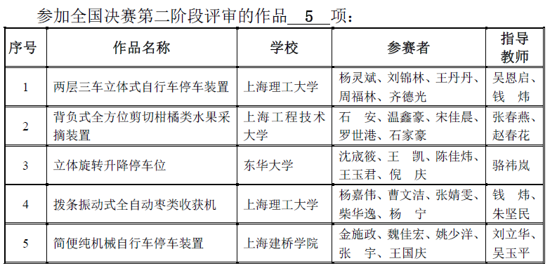 此次全国大赛初审中,我校与各知名高校同台竞争,《空中停车场》、《小区楼侧立体自动停车系统》项目获得了全国二等奖,占赛区二等奖项总数的七分之二。《简便纯机械自行车停车装置》更获得仅有的5个全国一等奖决赛名额,将于7月22日前往浙江工业大学参加全国一等奖现场决赛。