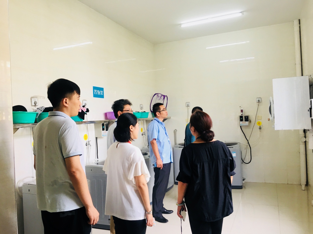 本次参观交流的重点内容为我校学生公寓基础设施以及各类功能用房,在王清明老师的带领下,一行人参观了我校北区宿管值班室、学生活动室、爱心屋、书院、洗衣房等,以及我校学生宿舍概念间北一428寝室。参观过程中,华东理工大学的后勤同仁对我校闸机门禁系统以及晚归管理系统十分关注,对我校楼内设施的完善程度以及人性化程度表示称赞。