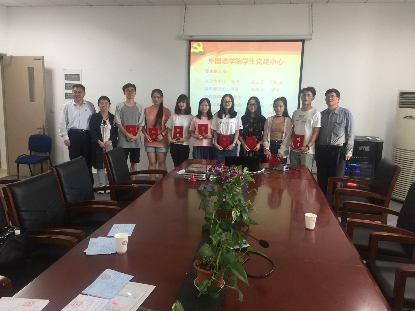 7月10日,外国语学生党建中心在学院楼229室举行表彰仪式。外国语学院党总支书记杨大亮教授、党总支副书记李雷老师、学生党建中心指导老师焦丽以及全体党建中心学生参加表彰会。