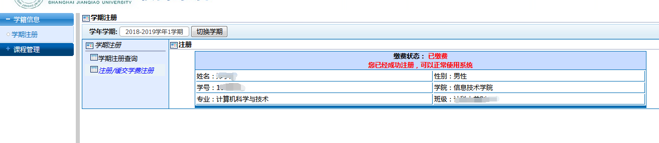 学籍信息=》学期注册=》选择学期(2018-2019-1学期)后切换学期