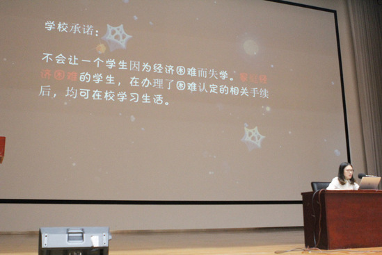 高祺老师就奖学金、助学金、助学贷款、雷锋奖章等一系列在校奖励向新生们做了具体介绍。旨在让同学了解力争奖励的基本条件的同时,激励所有在场新生明确学习目标、掌握学习方法,养成良好的学习生活习惯,争取德智体美全面发展,塑造更加完善全面的自己。