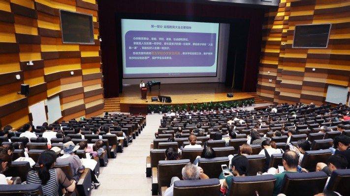 朱瑞庭校长讲话传达了全国教育大会的精神,并以“以德立身、以德立学、以德施教”为主题,结合习近平总书记新时代教育思想,阐释了作为一名人民教师要“德高”“学高”“艺高”。“以德立身”。“教师是人类历史上最古老的职业,是太阳底下最崇高的职业,是“人类灵魂的工程师”,是人类文明的传承者,承载着传播知识、传播思想、传播真理,塑造灵魂、塑造生命、塑造新人的时代重任。朱校长希望,全体教师要执着于教书育人,有热爱教育的定力、淡泊名利的坚守,回归教师教书育人的天职,严守教学规矩、课堂规矩,在大是大非面前,旗帜鲜明,立场坚定,态度明确。“以德立学”。致天下之治者在人才、成天下之才者在教化、教化之所本者在学校。“扎实的知识功底、过硬的教学能力、勤勉的教学态度、科学的教学方法是老师的基本素质,其中知识是根本基础。”朱校长强调,教师以德立学,就要“闻道在先”,先受教育,主动加强自身建设。“以德施教”。朱校长指出,教师要做到“艺高”,提升教学艺术,善于运用现代信息技术,提升改造学习、改造课堂的能力。教学是一门技术,是一门学问,更是一门艺术。它是“教”与“学”的沟通和对话,老师在“教”的过程中“学”,在“学”的过程中“教”,教学是老师和学生互动的过程,老师和学生要形成教学共同体,做到教学相长。朱校长希望全体教师要有大爱精神,要把学生的获得感作为衡量学校工作的标准之一,落实立德树人的根本任务,深入学习贯彻落实习近平新时代中国特色社会主义思想和习近平总书记在全国教育大会上的重要讲话精神,以“四有好老师”为标准,坚持“四个相统一”,践行“四个引路人”。
