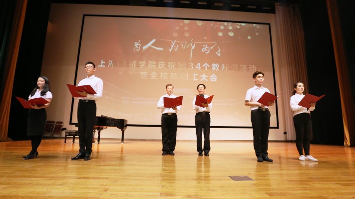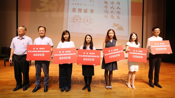 会上,周健儿副校长为第三届上海高校青年教师教学竞赛决赛获奖者孙文波、支颖雪、陈苏婷、覃岳锋、沈依慧、胡银平颁发奖金。为弘扬全社会尊师重教的风尚,在上海市教育委员会和中国教育工会上海市委员会的主持下,新版的上海市从事教育工作三十年证书今年启用,我校共有56名教职工从事教育工作已经达到或超过了30年,随着现场大屏幕的滚动,他们名字的出现,让全体教职工感受到了老教师们的温度。