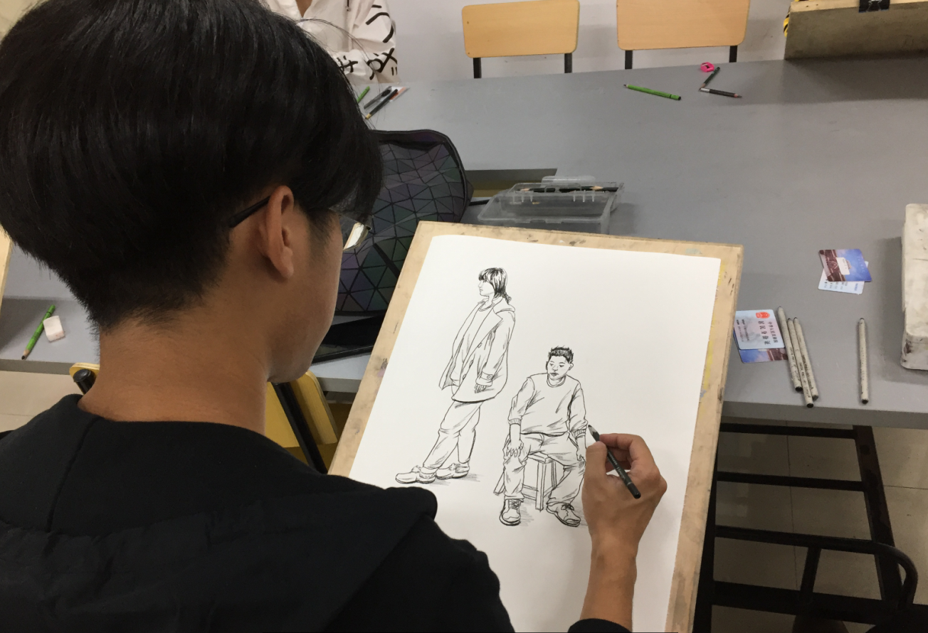 因考生人数较多,本次考试共分为两场。其中,第一场在17:00—17:40第二场在18:00-18:40,399名新生需在40分钟内完成两个人物组合的速写。考试当天,同学们早早就来到了考场做考前最后的准备。铃声一响,考试正式开始,大家都进入了考试状态,认真观察考题,先勾勒出简单的外形草稿,再从五官开始刻画人物形象。所有考场都非常安静,只听见铅笔在纸上摩擦的声音。