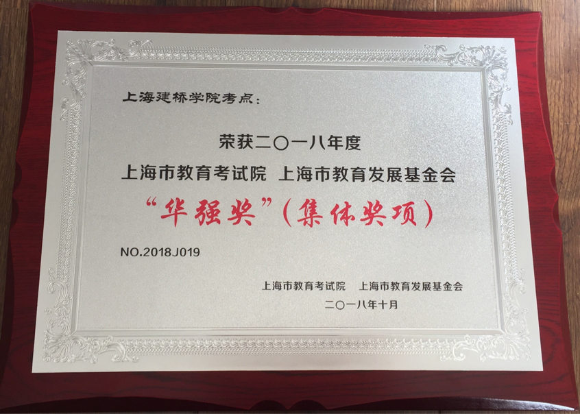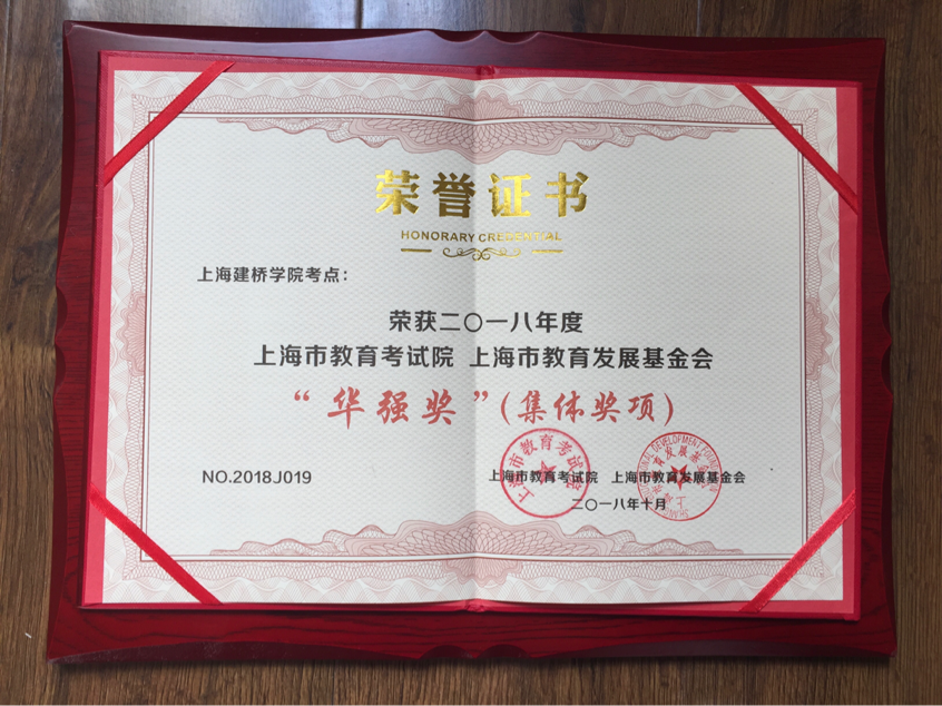 “华强奖”是由上海市教育发展基金会专设奖项,旨在推进考试招生制度改革、推动本市招考机构发展,激励和鞭策招考战线全体人员投身教育考试招生事业。上海建桥学院中小学教师资格考试(笔试)考点设立3年以来,已经顺利组织5 次考务工作:共安排布置考场388 个,组织考生10890 人次。建桥学院考点为临港高校在校生的教师资格考试提供了便捷的服务,其考务工作获得了广大师生的好评,也得到了上海市教育考试院的肯定。