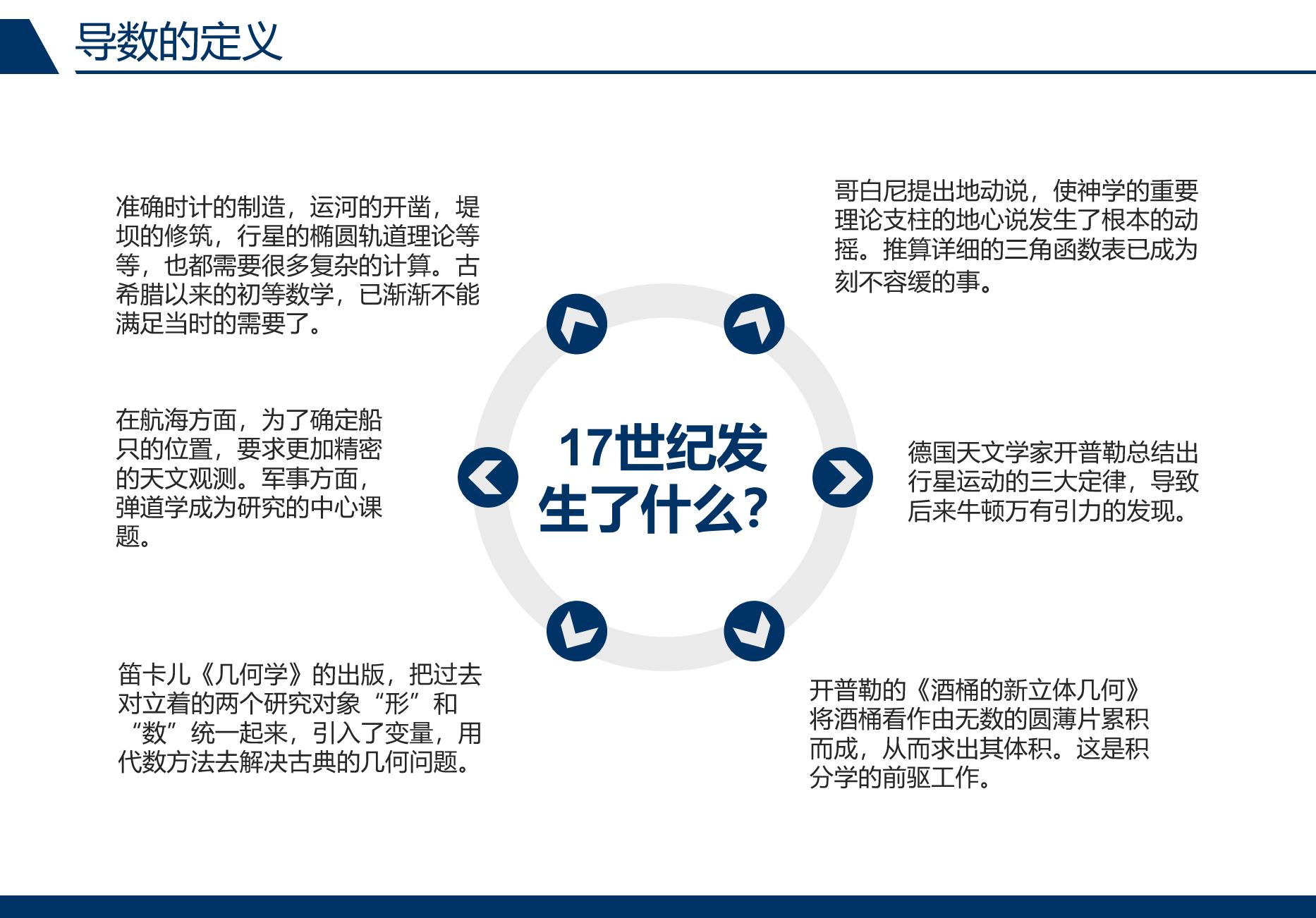 在课堂上讲述“导数”章节时,她讲起了“导数”诞生之初的故事。陈苏婷以“17世纪发生了什么?”的历史背景引入,让同学们了解微积分中先有“导数”、后有“极限”的时代背景。“日心说的发现,使得神学的地心说被动摇,于是有了文艺复兴。在这一时期,天文观测、航海勘察等科学技术的推动,带来了比以往任何时期都要复杂的计算问题,古典的几何算法已经不够用了,需要新的计算方法。微积分就是在这样的背景下产生的。但是一开始牛顿-莱布尼兹的微积分并不严密,导数中的