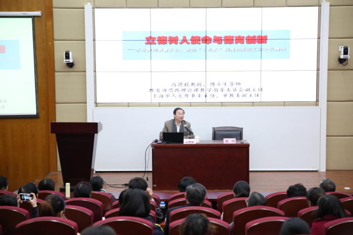 为进一步加强我校师德师风建设,引导广大教师深入学习领会习近平新时代中国特色社会主义思想和全国教育大会等文件精神,引导广大教师以德立身、以德立学、以德施教,争当学生“引路人”,争做有理想信念、有道德情操、有扎实学识、有仁爱之心的新时代好老师。11月16日,我校师德师风专题培训班在三教222报告厅开班。教育部思政理论课教学指导委员会副主任,上海市人大外事委主任,市教委副主任高德毅,我校副董事长黄清云,上海交通大学马克思主义学院院长王岩应邀作报告。校长朱瑞庭出席并作新时代教育思想大学习、大讨论动员报告。全体中层干部、正副系主任、青年骨干教师与会。党委书记江彦桥,党委副书记、副校长夏雨分别主持会议。