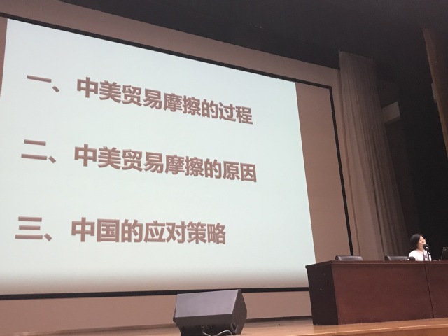 讲座过程中,荆教授首先从中美贸易摩擦的源起开始讲起,向同学们娓娓道来中美贸易摩擦的来龙去脉,并从中美两国和全球化视角,重点剖析此次贸易争端的深层次成因。荆教授指出,贸易不平衡是美国挑起摩擦的直接原因;真正原因则是中国崛起引起了美国的不安和猜疑,挑起贸易争端恰恰是美国遏制中国崛起的战略需要;此外,特朗普团队中,对华鹰派占据主导地位,也对中美贸易摩擦的发生发展产生了深刻影响。最后,荆教授系统分析了中国的应对策略,她语重心长地对同学们说:得道多助,失道寡助。面对不确定不稳定不安全因素增多的国际形势,中国不忘初心,始终与世界同行,顺大势、担正义、行正道,坚定不移维护多边贸易体制,坚定不移推动全球治理体系变革,始终做世界和平的建设者、全球发展的贡献者、国际秩序的维护者,坚定不移推动构建人类命运共同体。这就是中国应对未来中美关系的基本态度和举措。