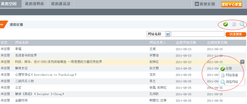 四、课程浏览和注册:点击“课程注册”后出现以下界面,选中某一门课程会出现下拉菜单,可以浏览该门课程的网站或进行注册。或者直接选中课程后点击右上方的图标进行浏览和注册。