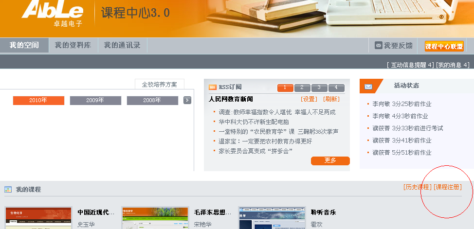 三、我的空间:进入“我的空间”后,在右下方点击“课程注册”