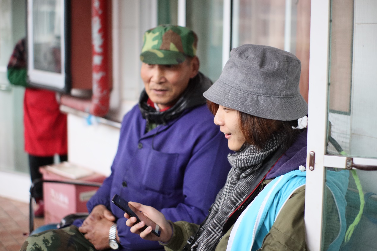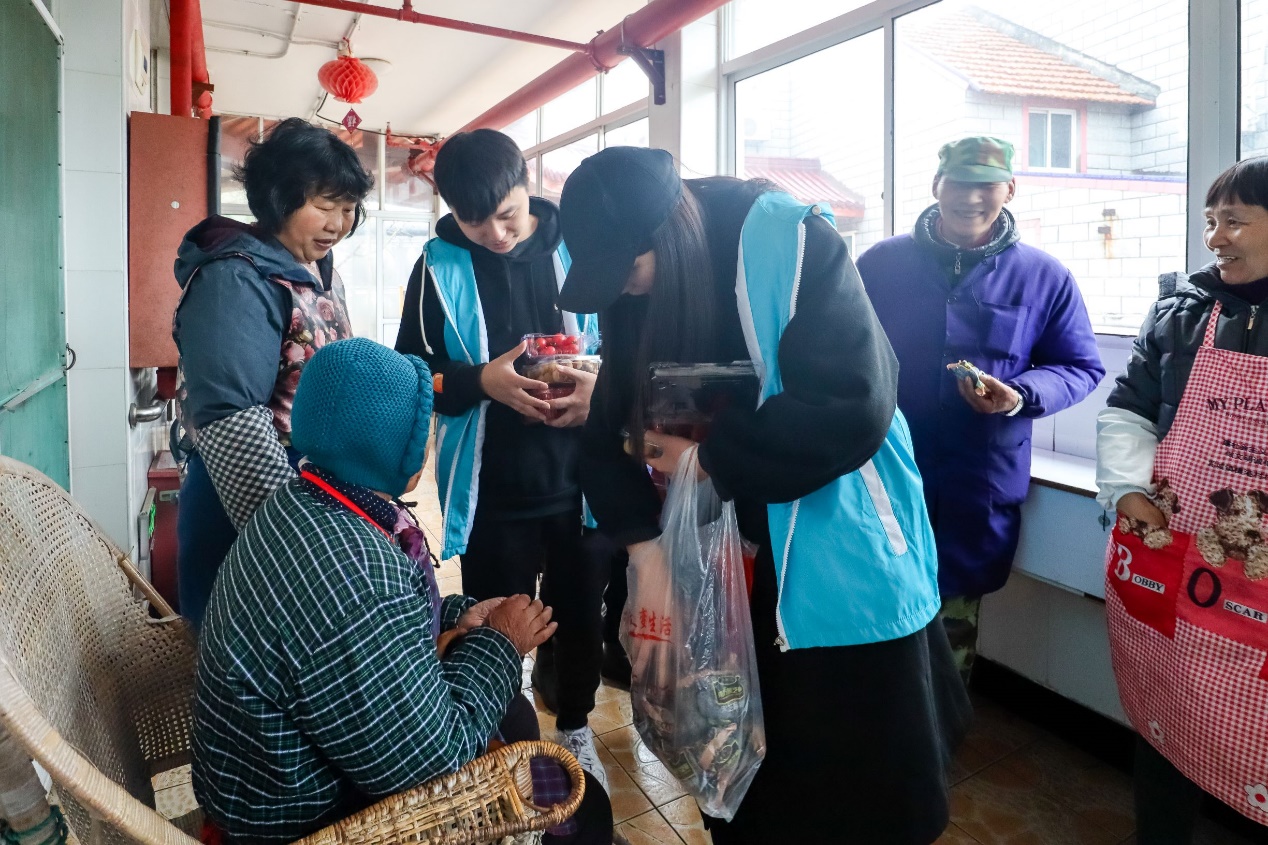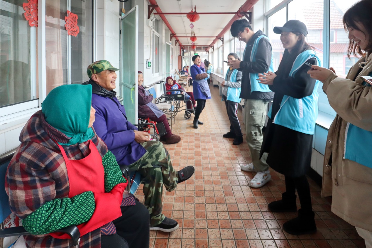 中午时分,志愿者们顺利到达养老院。在院长简短地介绍养老院的基本情况后,志愿者们纷纷把带来的水果、牛奶等慰问品送到老人们的手里。看到这一群朝气蓬勃的大学生,老人们的脸上绽放出灿烂得笑容。志愿者们一边为老人们捶背揉肩、按摩梳头,一边和老人们话家常,亲切询问他们的近况,提醒他们注意饮食卫生、行动安全。值得一提的是,在得知老人们喜欢唱歌后,大家纷纷唱了起来,从《东方红》到《闪闪红星》,歌声中洋溢着满满的温暖与幸福。