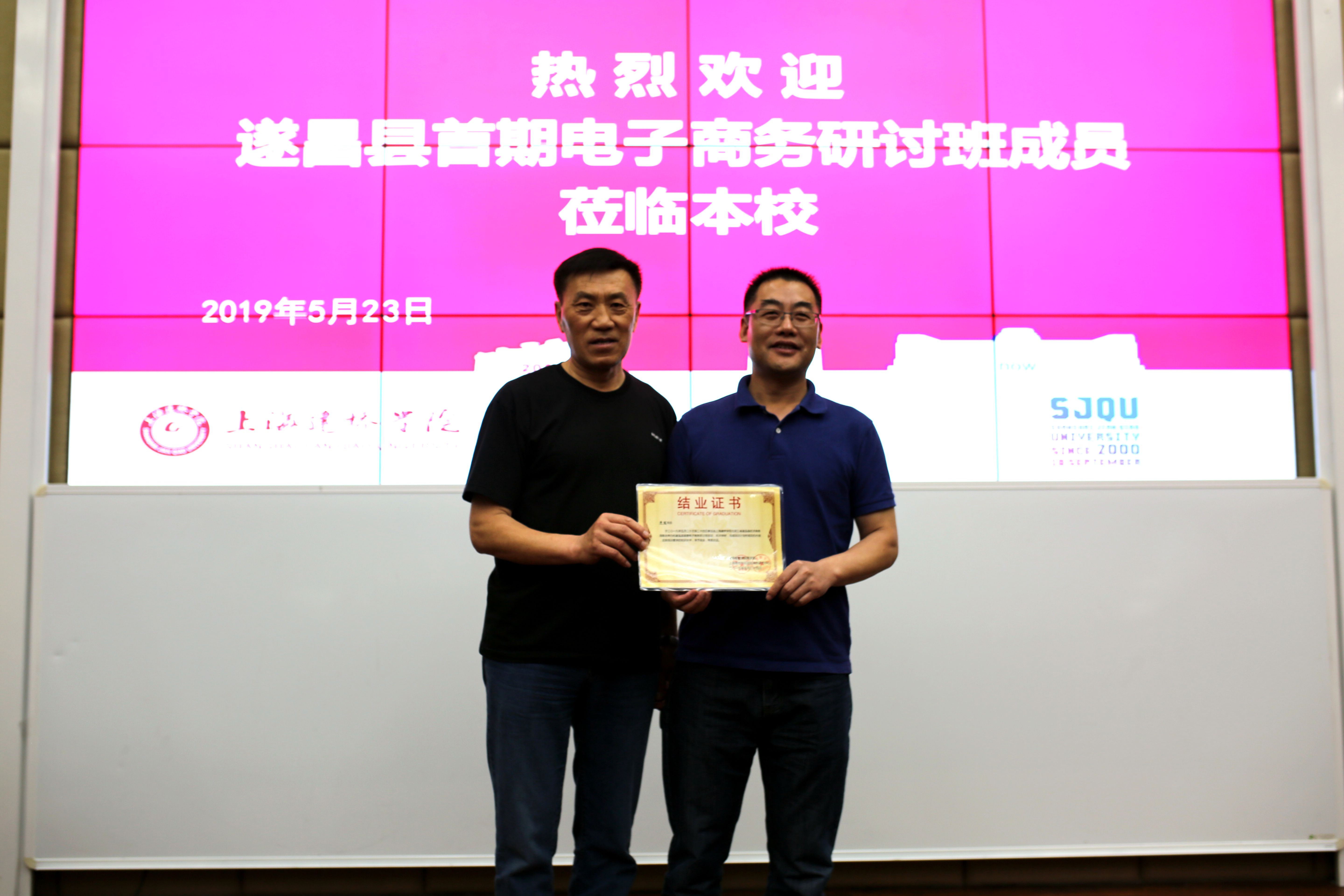 研讨班结束后,商学院高健院长与遂昌县经济商务局华俊副局长向学员们颁发了结业证书。本次研讨班的举行,不但把商学院的部分科研成果应用于社会生产实践,而且也为将来的农村电商研究以及引进相关的横向课题奠定了基础。