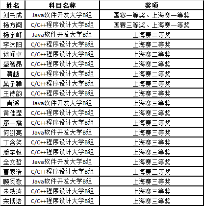 全国赛前,我校信息技术学院经过校内选拔,选出20名学生参加省赛(上海赛区)本科组的软件类比赛;另外,有21位同学自愿报名也参加了省赛(上海赛区)本科组赛事。获得上海赛区一等奖2名、二等奖5名、三等奖13名的成绩。其中,16级软件工程专业杨方闽同学、16级计算机科学与技术专业刘书成同学成功晋级国赛决赛。