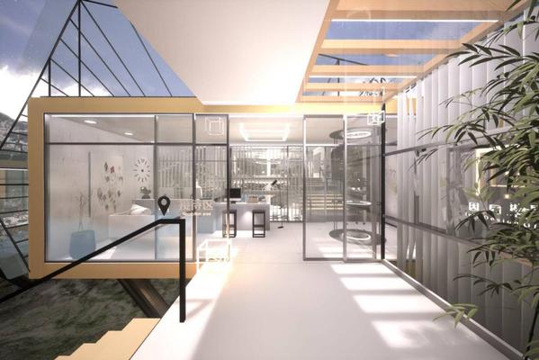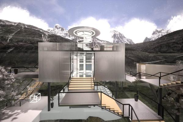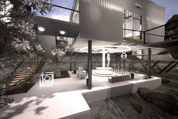 “让建筑与周边环境相契合是我和导师定下的基本构思基础,同时在导师的引导下,我把未来元素引用到了我的作品之中,人工智能Ai、全息投影技术以及太阳能百叶是最主要的三个技术。”