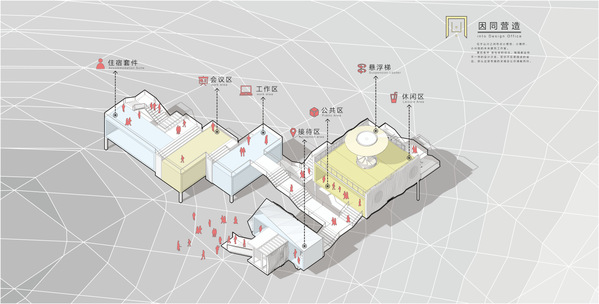 施俊杰在介绍作品时谈到,“因为设计给定的选址位于众山环绕的内陆湖旁,处在山势缓冲之间。我给自己的作品取名叫《山川因同》,山川是因为它位于山川之间,“因同”来自英文into的音译谐音,意指一群志同道合的设计爱好者在这里一起设计创作。”