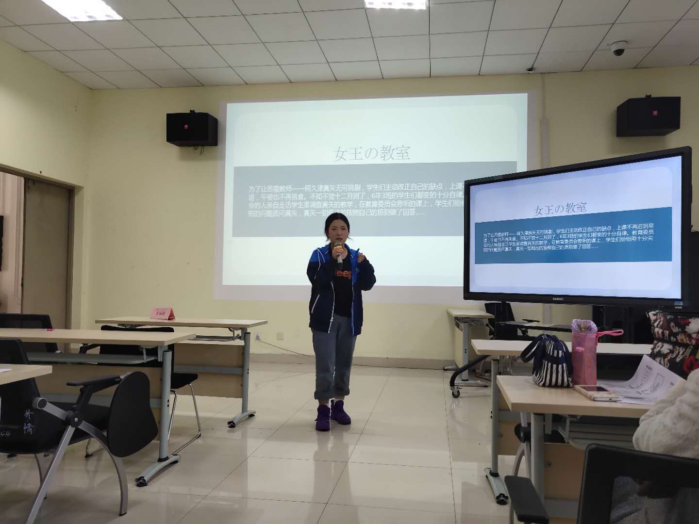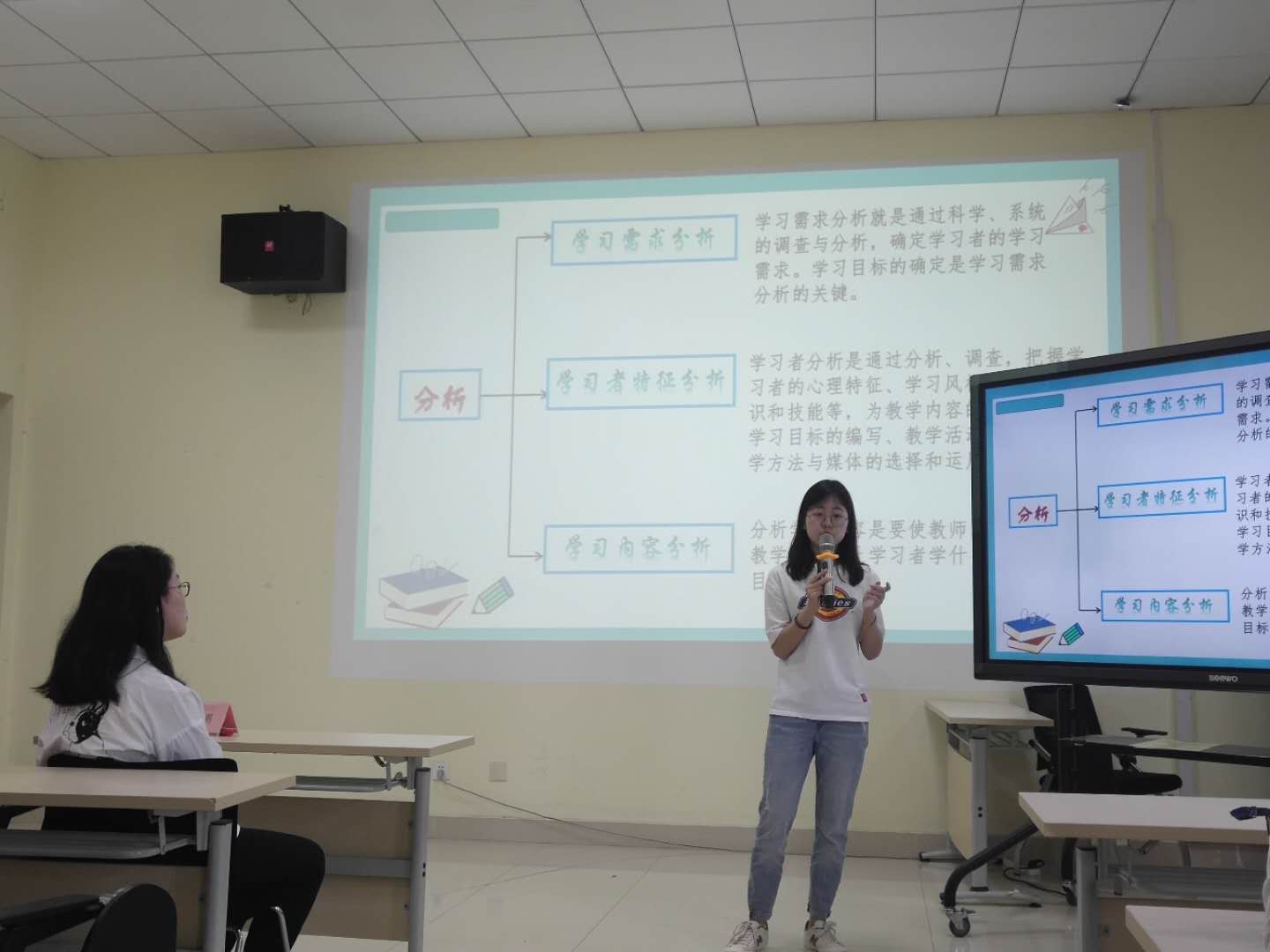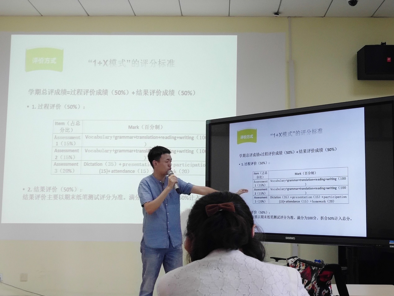 6名同学结合各自课程的特点,从不同侧面进行说课,各有特色。英语系18级李瑶村同学从课程基本信息、学习目标、教学重难点、评价方式和具体的教学时间安排等方面向大家全面介绍了《基础英语》课程,尤其是如何在小组讨论中融入课程思政的内容。日语系杨伟豪同学通过带读单词、讲解词汇、句子、语法,并与同学们展开互动,真实地展现了《基础日语2》课堂的教学过程。德语系张岄同学从中级德语与高级德语的区别谈起,分为四个篇章向大家介绍了《高级德语》课程的学习目标、教学实施、评价方式等内容,并分享了自己学习德语三年来的感悟。英语系冯明吉、曹妍洁两位同学从课程的概念、课程的理论基础、教学设计模式与要素、舞动美语案例分析等四个方面对《英语教学设计》课程进行了介绍,展现了该课程理论与实践相结合的特点。日语系王紫宸同学开场用一段《女王的教室》片段吸引了大家的注意,然后她讲解了视频的大意,尤其是里面的词汇、句型等内容,生动有趣地展现了《日语视听》课程的教学过程。