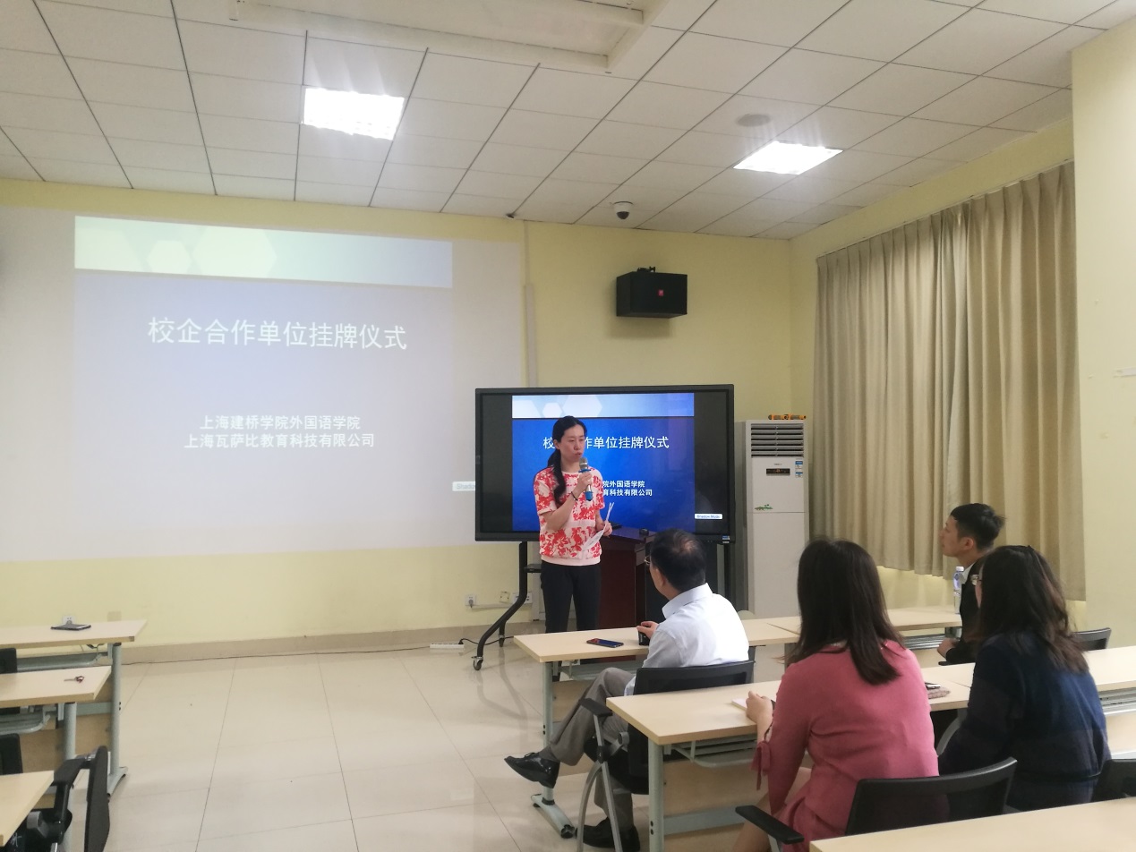 上海瓦萨比公司的董超总经理一行人员来到建桥,与老师和同学们就今后的合作进行了一系列探讨和交流。出席本次仪式的有外国语学院毛立群院长,江萍书记,孙俊芳副书记、日语系章虹主任、贺亚茹老师以及16级的同学们。