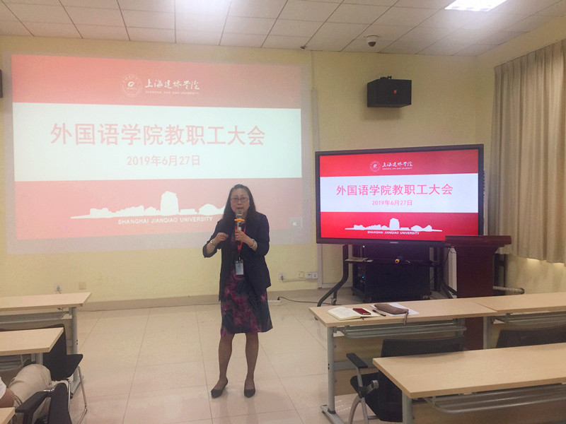6月27日,外国语学院在学院129会议室召开了全院教职工大会,校长朱瑞庭,外国语学院院长毛立群,党总支书记江萍,代理副院长、大英部主任陈永明,办公室主任董显洋,党总支副书记孙俊芳及全体教职员工参加了会议,会议由党总支书记江萍主持。