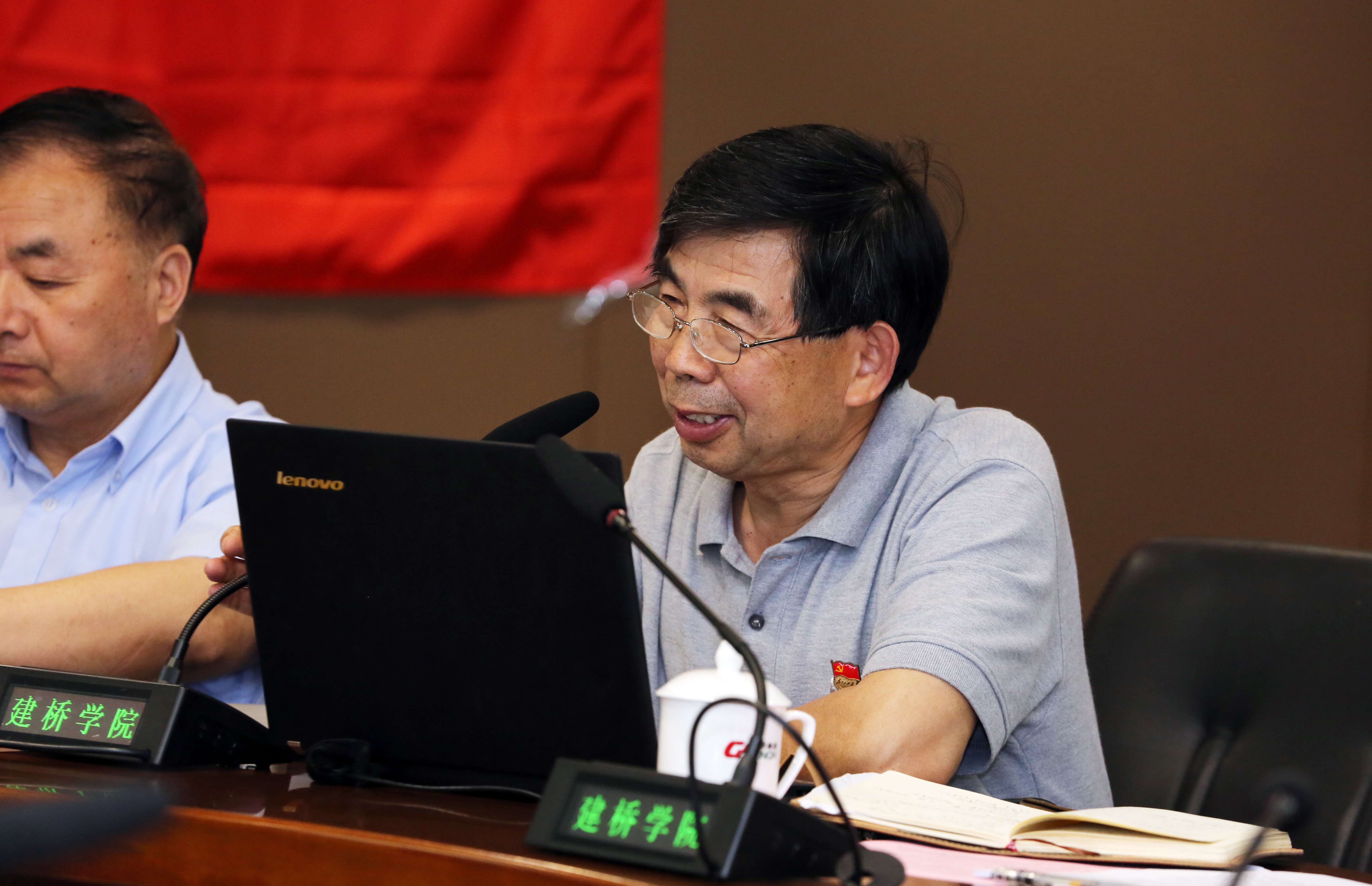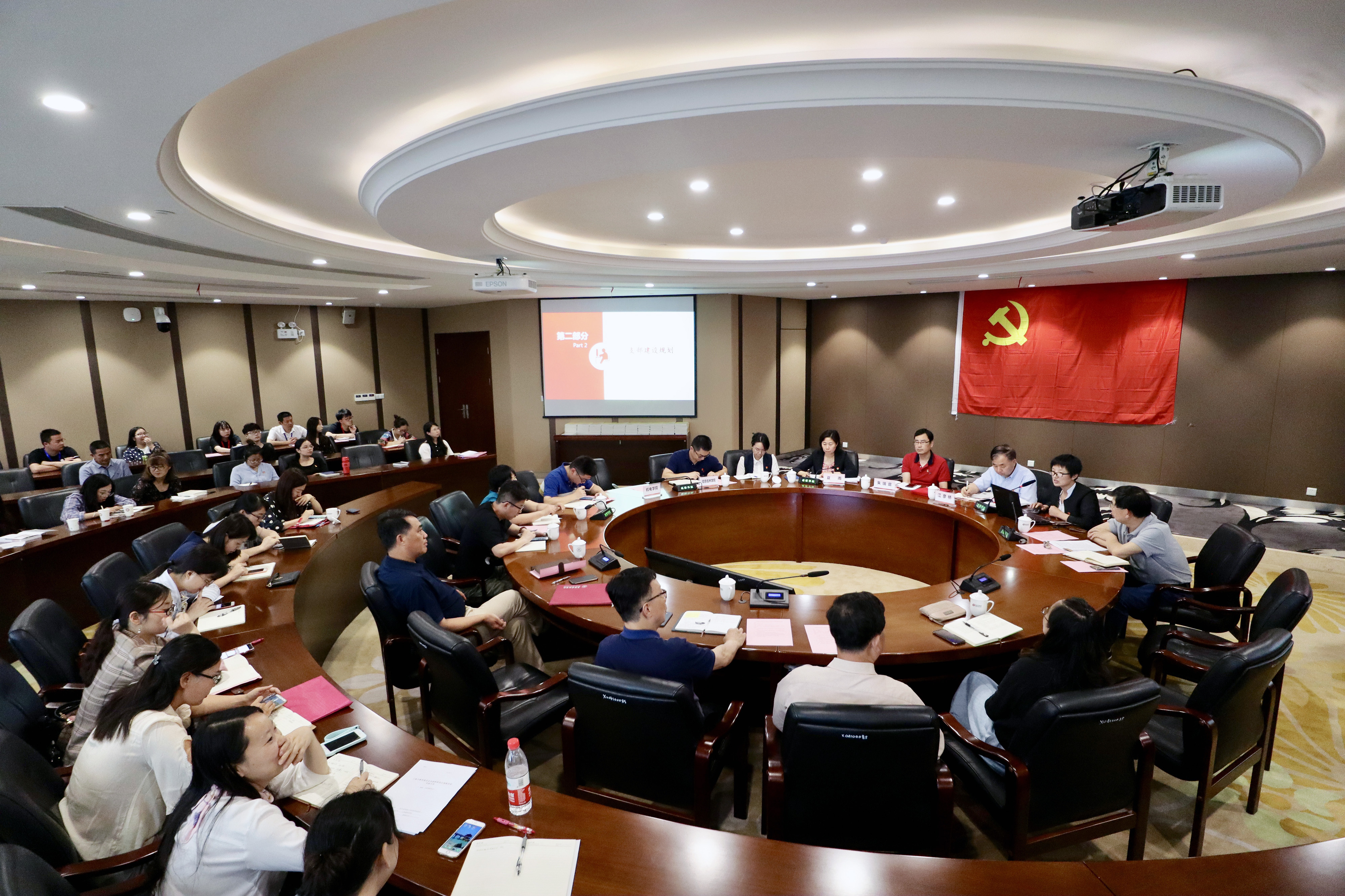 校长朱瑞庭,校长助理陈伟,校党委委员,各学院党总支正副书记、组织委员,党支部书记,工会、团委负责人,党委部门全体人员与会。党委副书记、副校长夏雨主持会议。