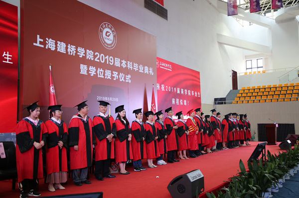 刘爱香书记宣布,根据《上海建桥学院学士学位授予工作细则》规定,同意朱佳皓等1140名同学毕业,同时,授予工程管理、工商管理、金融工程、国际经济与贸易、会计学、电子商务、物流管理、旅游管理专业朱佳皓等1054名同学学士学位。商学院全体毕业生着学士服,戴学士帽依次上台进行学位授予仪式。