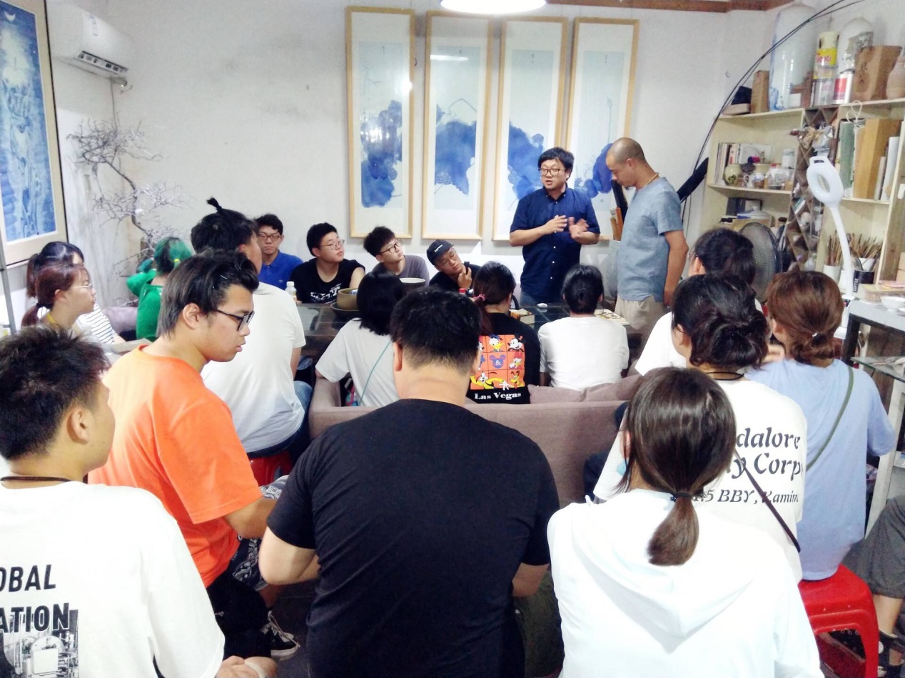 杨锋和徐青老师正在给同学们讲述青花料的使用和表现形式