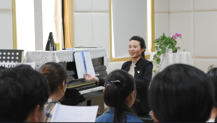 肖晶老师在来高校授课前,曾指导过3岁-80岁零基础的学生进行歌曲演唱。“走到学生中去”的肖晶老师,也非常擅长用理论指导实践。本次比赛中,她选用《我爱你中国》歌曲,为学生进行音乐理论分析与演唱技巧指导。学生通过分析曲谱,了解作者的创作意图,并更好将课程原理运用到实践中,从而用更好的音色、气息、节奏唱歌。虽然教龄不足五年,肖晶表示,学校为比赛而开展的培训与指导,对她参赛获奖帮助很大。“比赛期间,不只是自己一个人在战斗。”