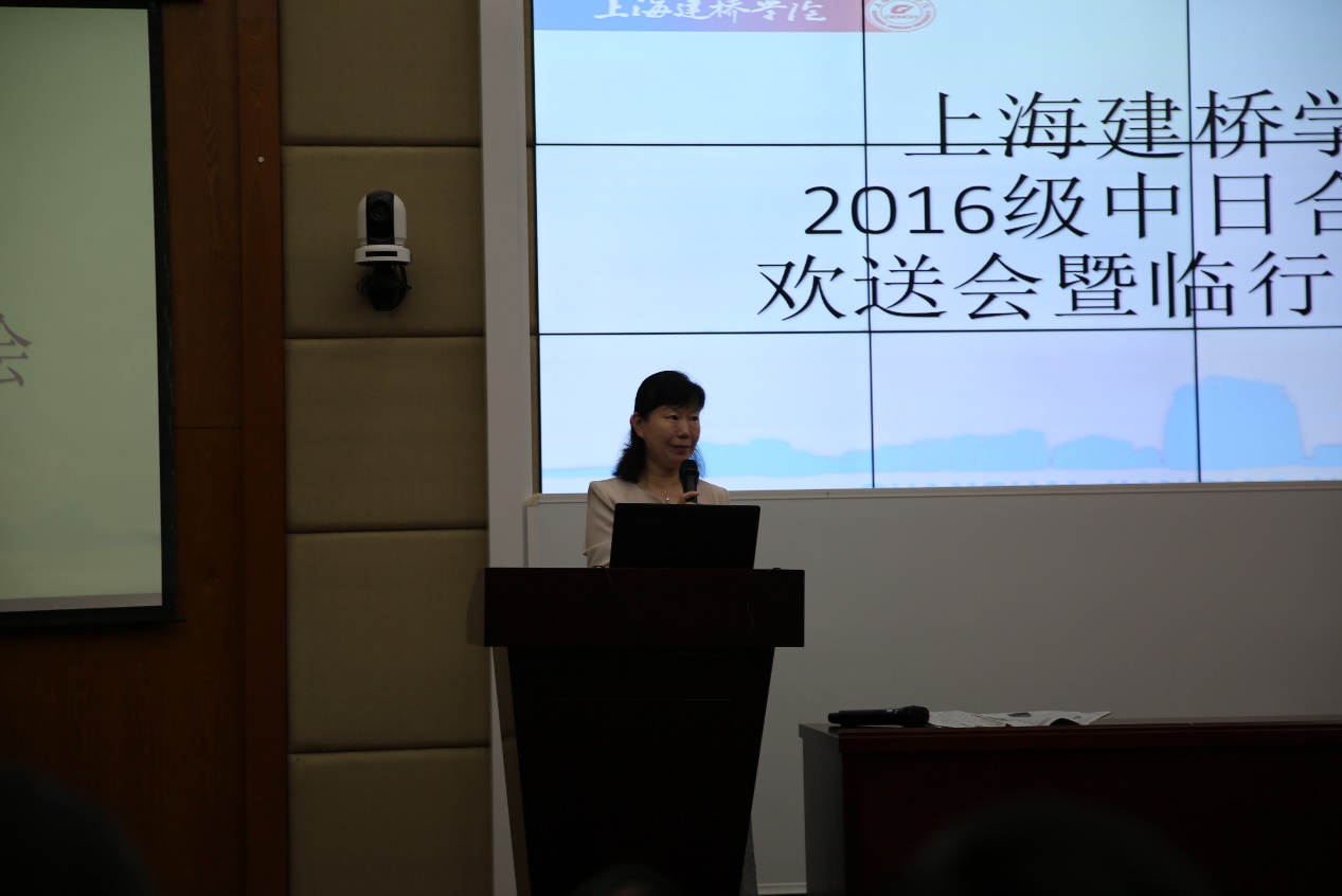 京都情报大学院大学留学生业务部部长李美慧致辞。她表示在欢送会的交接仪式上,学校将郑重从上海建桥学院手中接过125位同学学习、生活的接力棒,希望在下一个五年中,两校能在教学发展、学生培育上深化合作,走上新的台阶。