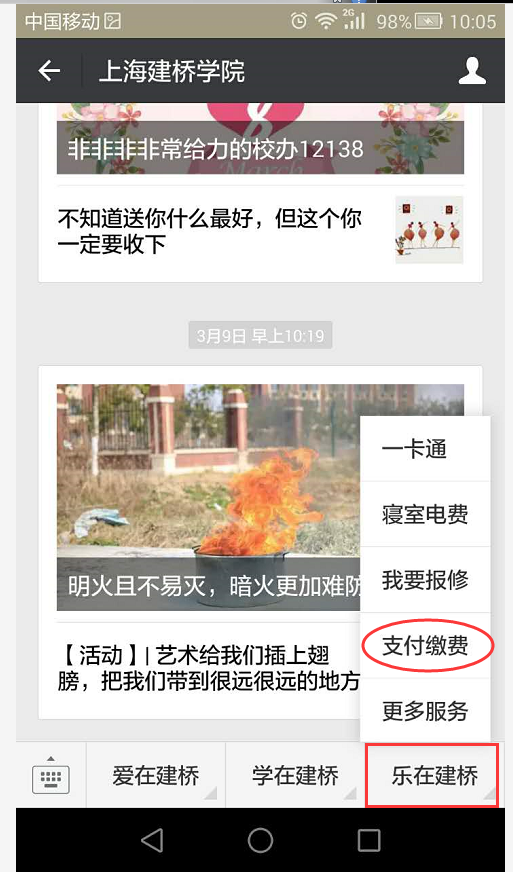2.进入“上海建桥学院”公众号后,点击“乐在建桥”“支付缴费”。