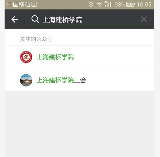 1.登录微信后,点击“添加朋友”“公众号”,查找“上海建桥学院”,并添加关注。