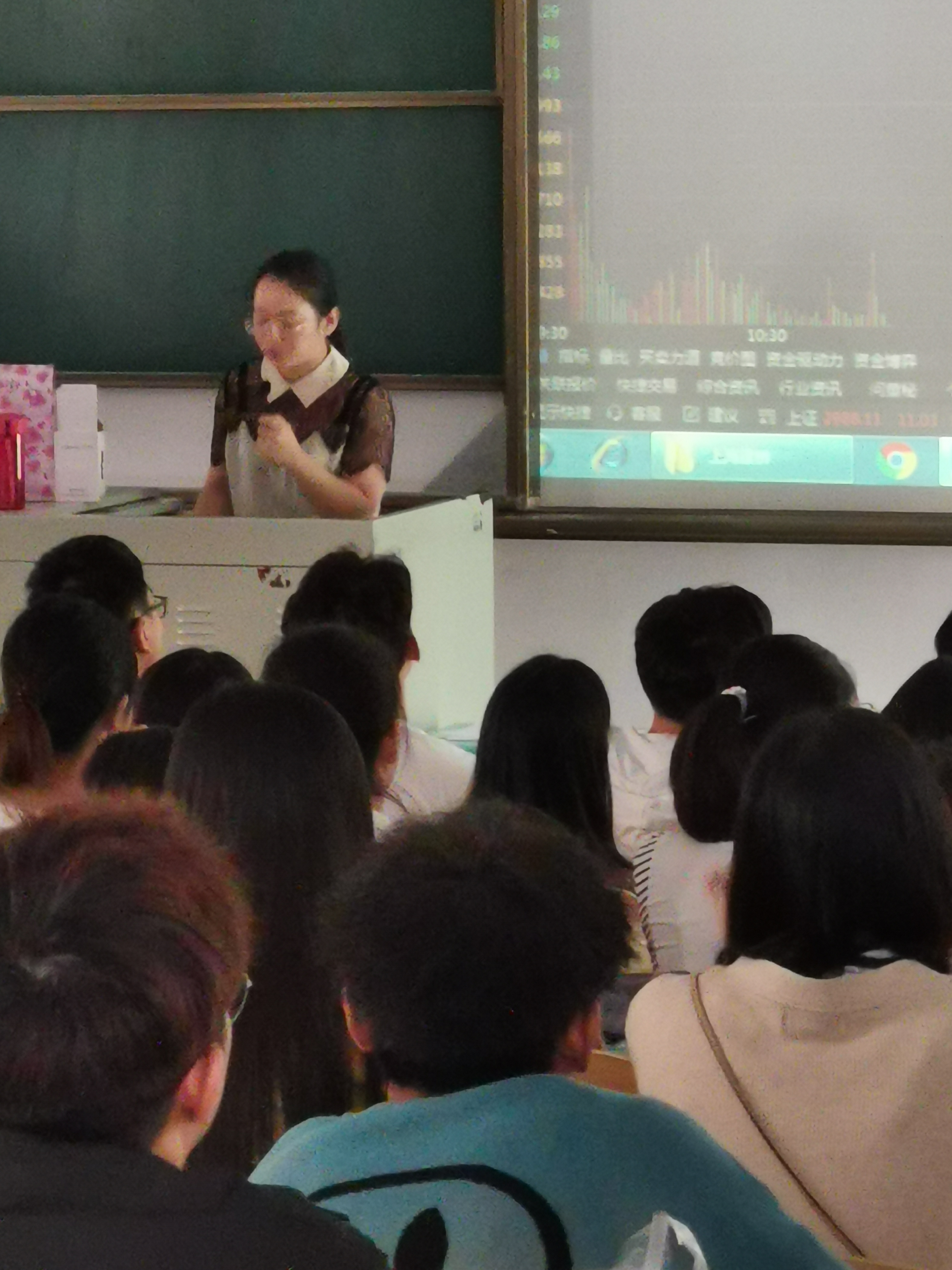 国泰君安证券股份有限公司零售业务部郑斐斐、陈尚娇,网络金融部王蕾,及虎博科技公司区域总监吕品为在场同学细致解说了此次大赛的报名流程和参赛的硬性要求,并与同学们交流了有关炒股方面的经验。