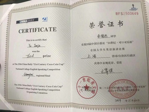 11月30日,职业技术学院17级商英专业余俊杰同学在25届“21世纪·可口可乐杯”全国大学生英语演讲比赛上海赛区决赛中斩获三等奖。