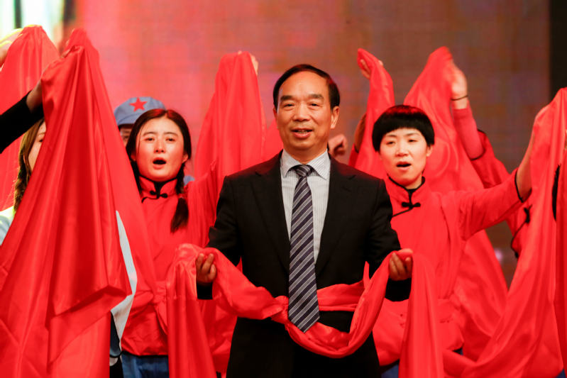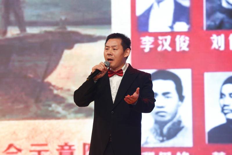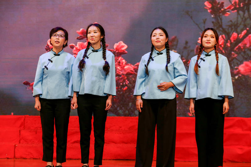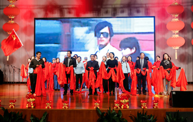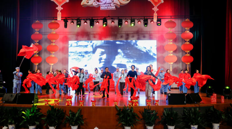 (由教工合唱协会和机关三工会共同演绎的红色讲点歌舞片段重现了百姓喜迎红军的历史场景,展现了历史革命情怀。)