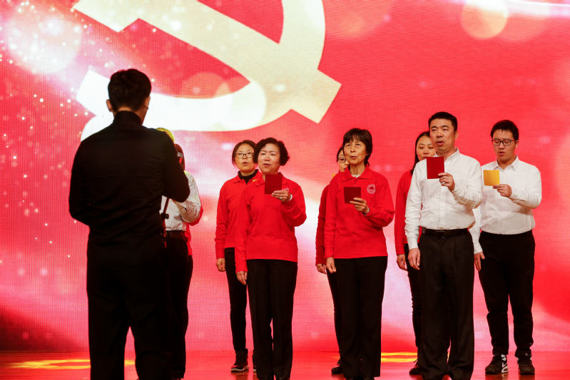 (职业技术学院带来合唱和朗诵节目《不忘初心》,宣誓不忘初心、牢记使命,展现共产党人的责任担当。)