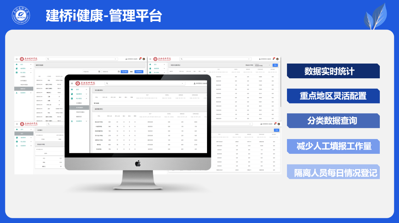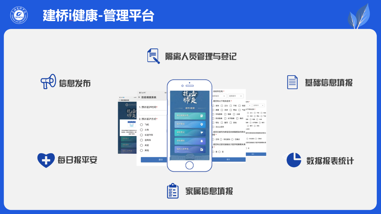 困难面前,作为上海市信息化标杆培育校又是上海市后勤协会信息化专委会秘书长单位,学校信息办703工作室主动请缨,联合学工部、教务处、人事处迅速组建了一支协同合作的信息化青年突击队,据市教委后保处要求,在协会信息化专委会、高后中心支持下,紧急开发疫情防控系统。青年突击队积极发挥信息化自主开发能力,依托校级移动端服务平台和pc端管理平台,突击开发完成“建桥i健康”管理系统。并根据上海市教委下发的《上海市高等学校和中等职业学校防控新型冠状病毒肺炎疫情开学指南(试行)》,以落实校园防疫防控措施、提高信息搜集与监测的效率、尽可能减少交叉感染和推进隔屏不隔爱暖心工程为目标,根据学校管理实际,开发了针对开学前、报到日、开学后的各类应用来助力校园疫情防控期间的管理服务场景。