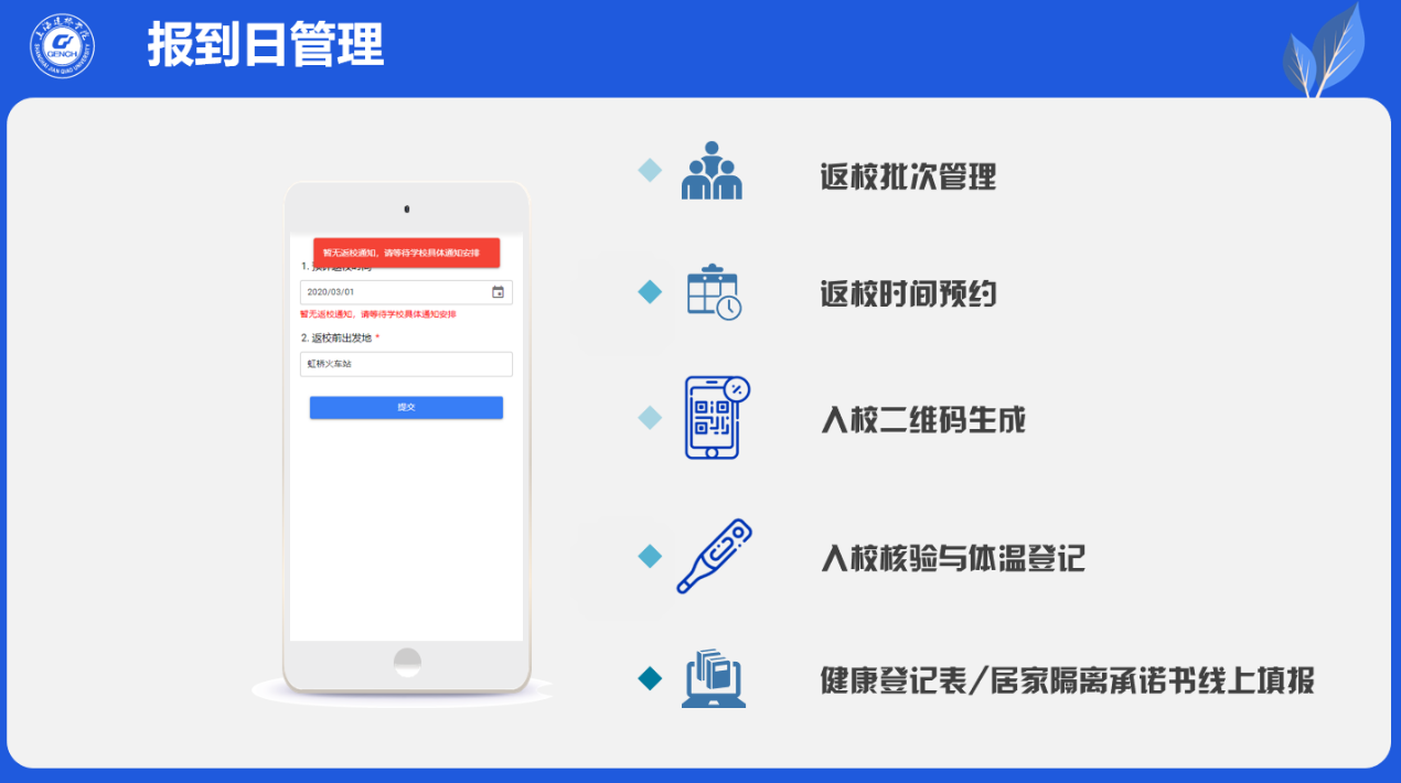 上海建桥学院根据上级要求,坚持做到“疫情不结束,师生不集中”,但同时积极稳妥做好开学各项准备工作。在疫情得到控制后,能够稳妥的按批次返校,保证该入校的一个都不少,不能入校的一个都不进,并做好各项防交叉感染工作,也是个需要攻克的难题。基于每日健康打卡的填报基础,为学校提供决策数据,提早研判开学安排。同时突击队成员开发并上线了返沪登记和返校登记功能,动态掌握每一位师生所在地和返沪情况,联合学工部一起做好每一个师生的开学接待方案。一旦学校具备了开学条件,根据学校要求分批次对符合要求的学生进行返校通知发送,同时生成入校二维码用于返校当日的入校身份和体温核验工作。通过系统,能够迅速及时的采集学生入校时间、体温情况等数据信息,为后续校园疫情管控提供进一步的数据基础。同时对于重点地域与非入校时段学生自动提醒,分类分策,尽快的分流人群,达到精准数据采集、快速入校,及时辨别身份,防止感染的目的。