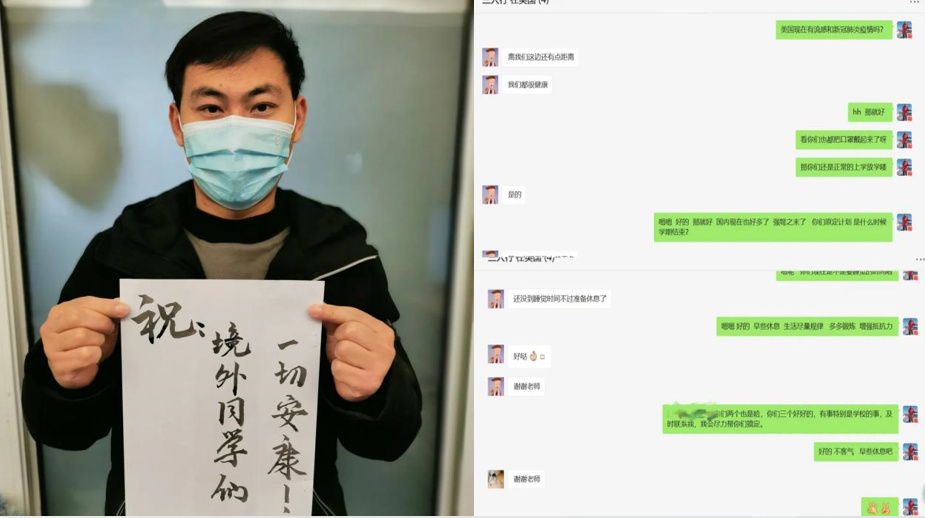 在境外同学们,你们好,现国内外都发生了疫情,你们的一切都牵动着老师的心,希望同学们要重视起来,不要疏忽大意,减少出门,出门要做好防护措施,勤洗手,多通风,一定要保护好自己,有任何情况第一时间与老师联系,老师会一直在线,让我们一起加油,共度难关,愿你们一切安好,早日学成归来,为祖国的建设贡献力量。